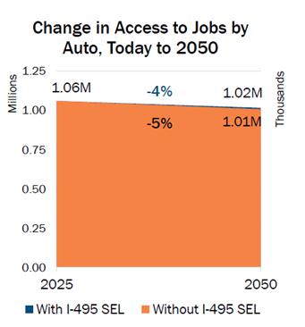 Furthermore, when it comes to achieving the goal of reducing vehicle miles traveled (VMTs), the impact of these changes is negligible. The DC region will still increase total daily VMTs by 15% above today’s levels in the new plan compared to a 15.4% increase in the old one. In other words, we have traded a 0.4% decrease in VMTs for a 22% increase in delays and a 5% decrease in job opportunities for DC area residents who rely on automobiles to get to work.